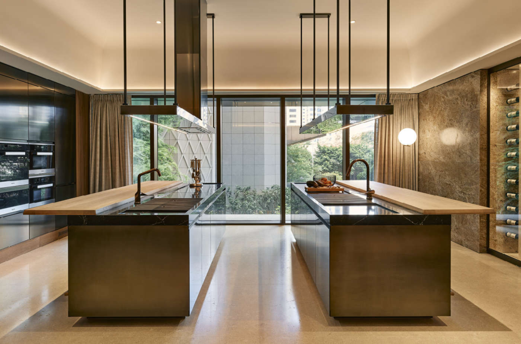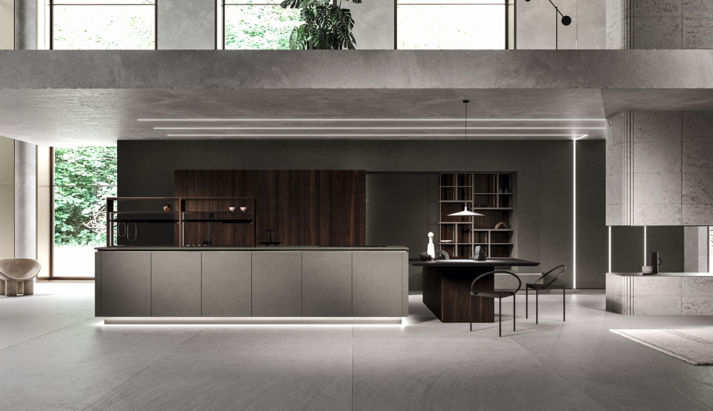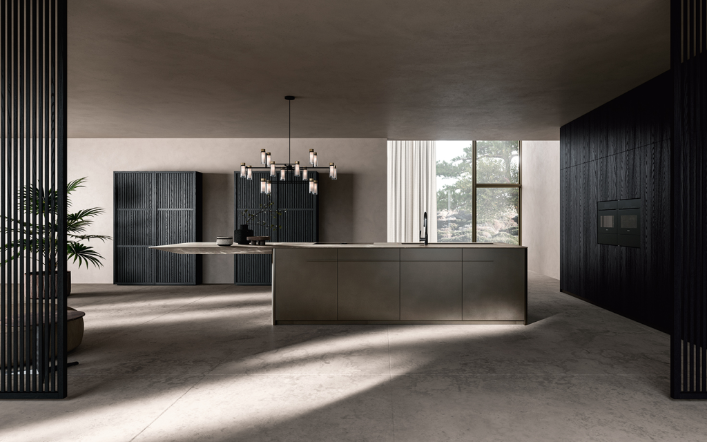 In particolare, lo stile minimale e pulito che caratterizza tutti i modelli di Key Cucine in questa composizione si manifesta in una modalità nuova, con forme morbide e arrotondate. Volumi significativi e di grande impatto per l’isola che torna protagonista assoluta: il top misura in lunghezza 4,60 m di cui 1,65 m in totale sospensione; 1,30 m in profondità per 94 cm di altezza (variabili in base alla personalizzazione del progetto. Grande attenzione anche per i materiali, sempre ricercati e pregiati, come il marmo “Emotion Grey” per il top ed il bancone e la finitura bronzata, a peltro, effetto metallico per le ante.